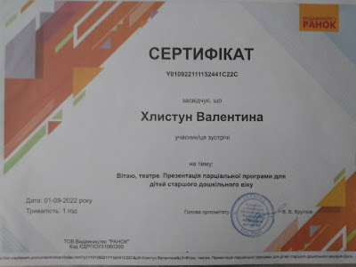 засвідчує, що Хлистун В.М. пройшла підготовку творчої групи "Методичні аспекти формування художньо - продуктивної компетенції дітей дошкільного віку"